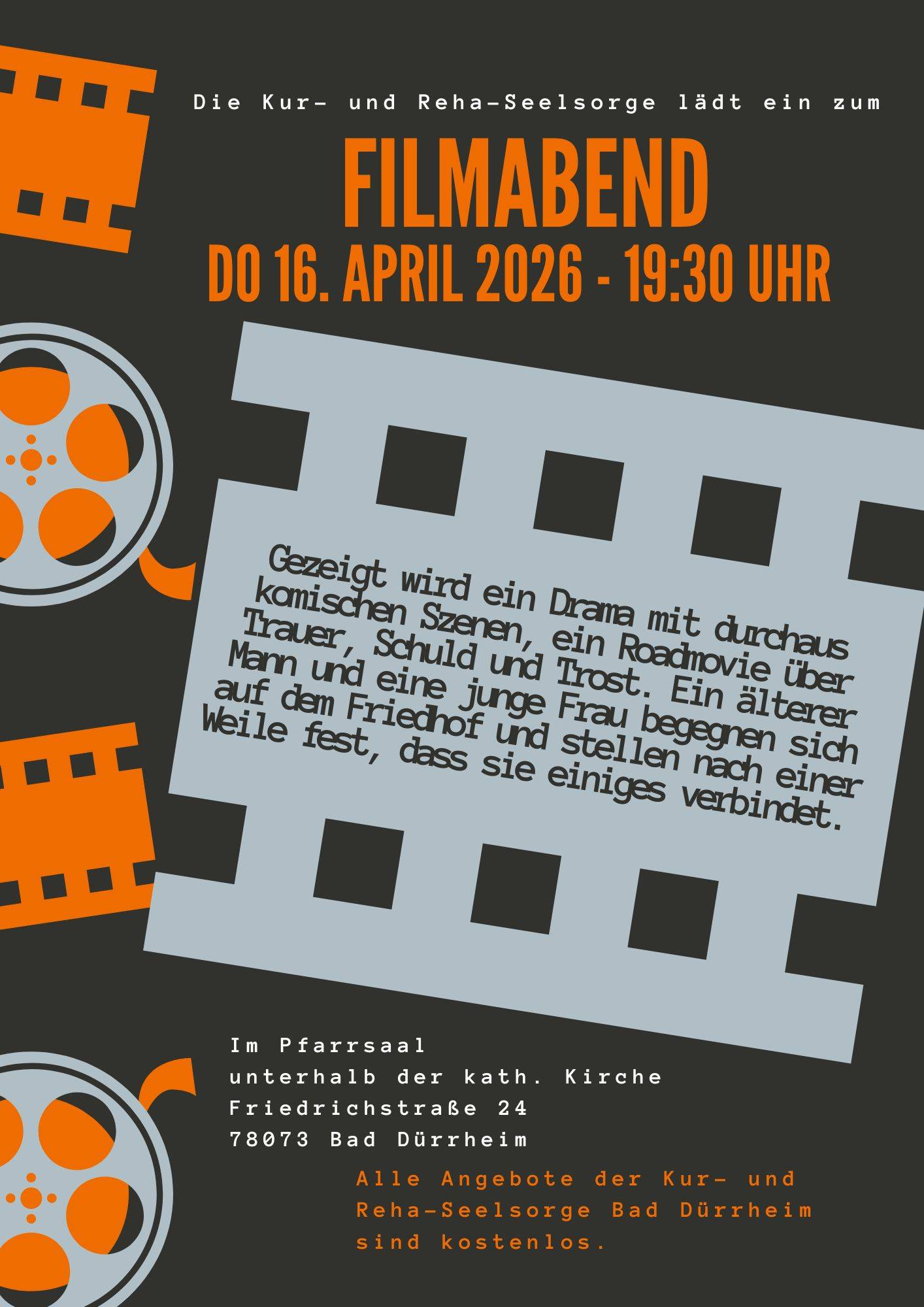 Der nächste Filmabend findet am Donnerstag, 16. April 2026 um 19.30 Uhr im Pfarrsaal in der Friedrichstraße 24 unter der katholischen Kirche statt. Durch die Lichter bekommt der Saal wieder Kino-Atmosphäre - Getränke und Knabbereien werden angeboten.